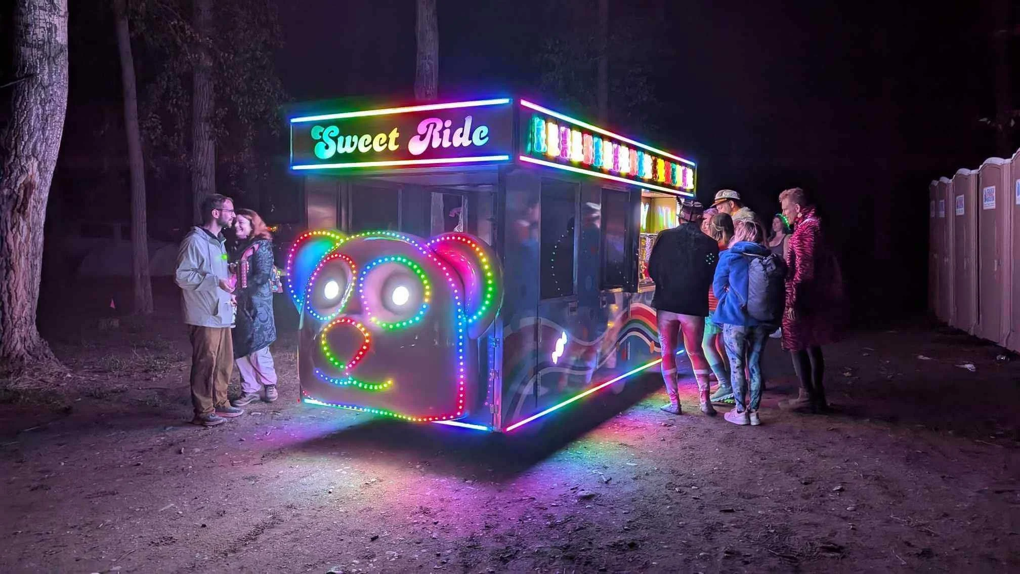 The Sweet Ride is a art car built at the TheEgg Arts Society as a collaborative project involving over 40+ individuals that helped bring it to life. I was fortunate to be the electrical and lighting team lead, responsible for designing and implementing the the electronics and software that went into powering the LEDs that bring the art car to life at night. Together with dozens of other people we installed 40 backlit resin gummy bears along the edge of the vehicle, glowing signs, and LED strip lighting.