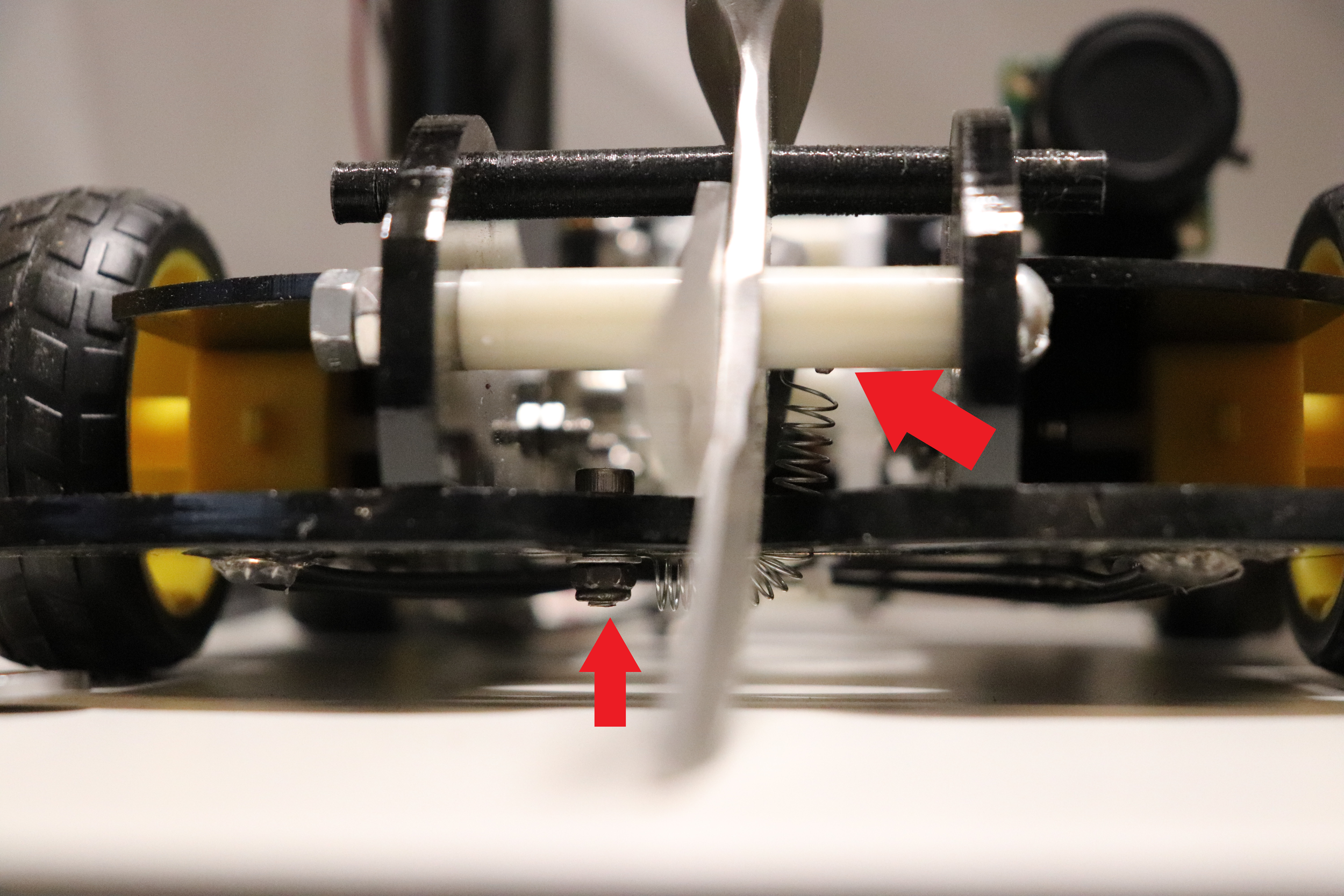 Unfortunately, the internal torsion spring of the scissors was so strong that when the scissor sprung open, the acrylic would shatter after just a few cycles. To overcome this I removed the scissors’ torsion spring and replaced it with a weaker tension spring as shown in the image below. One end of the tension spring is bolted to the underside of the robot frame and the other end to the moving scissor blade.